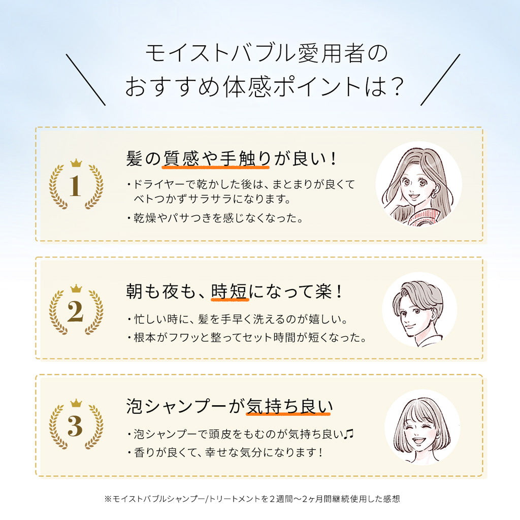 モイストバブルトリートメントとセットでご使用いただくことで、より髪のまとまりや、ツヤ感をご実感いただけると存じます。ぜひともお試しくださいませ。