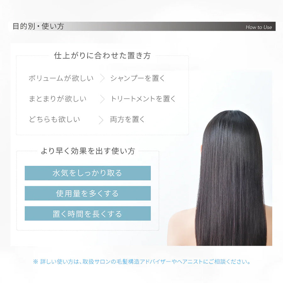 シャンプー後、適量を髪全体に広がりを持って塗布し、3〜5分後、軽く洗い流してください。潤いのあるしなやかな髪を保ちます。